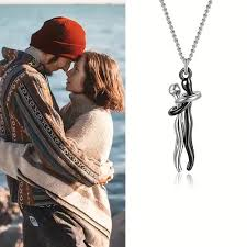 The design of the necklace pendant looks like two lovers hugging each other.